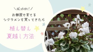 お手入れ方法【 シクラメンを買ってきたら 】室内で数年楽しむ方法 【成功例! シクラメンを買ってきたら 】最初の植え替えと休眠させない夏越しで来年も楽しむ方法を成長記録と共にご紹介しています。 2025.11.08お手入れ方法