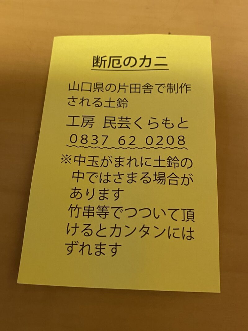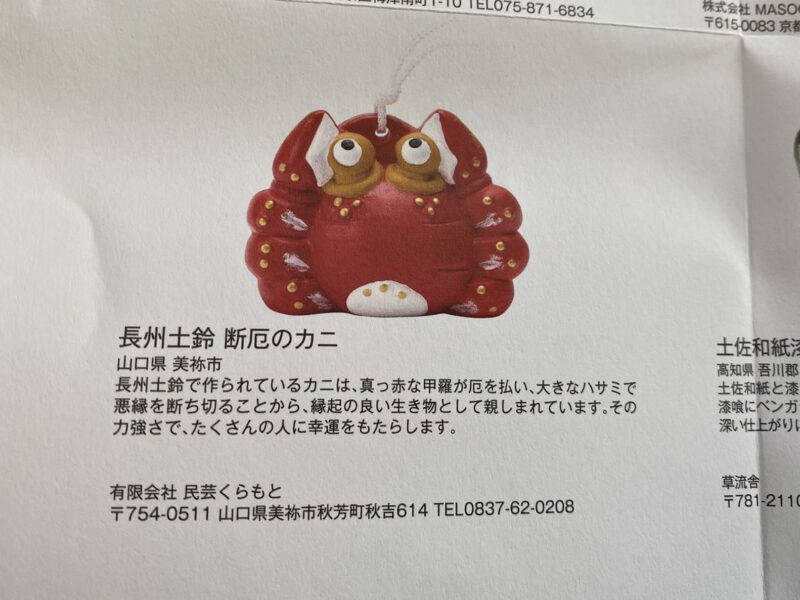 説明書きには、山口県の「長州土鈴 断厄のカニ」という名前がありました✨