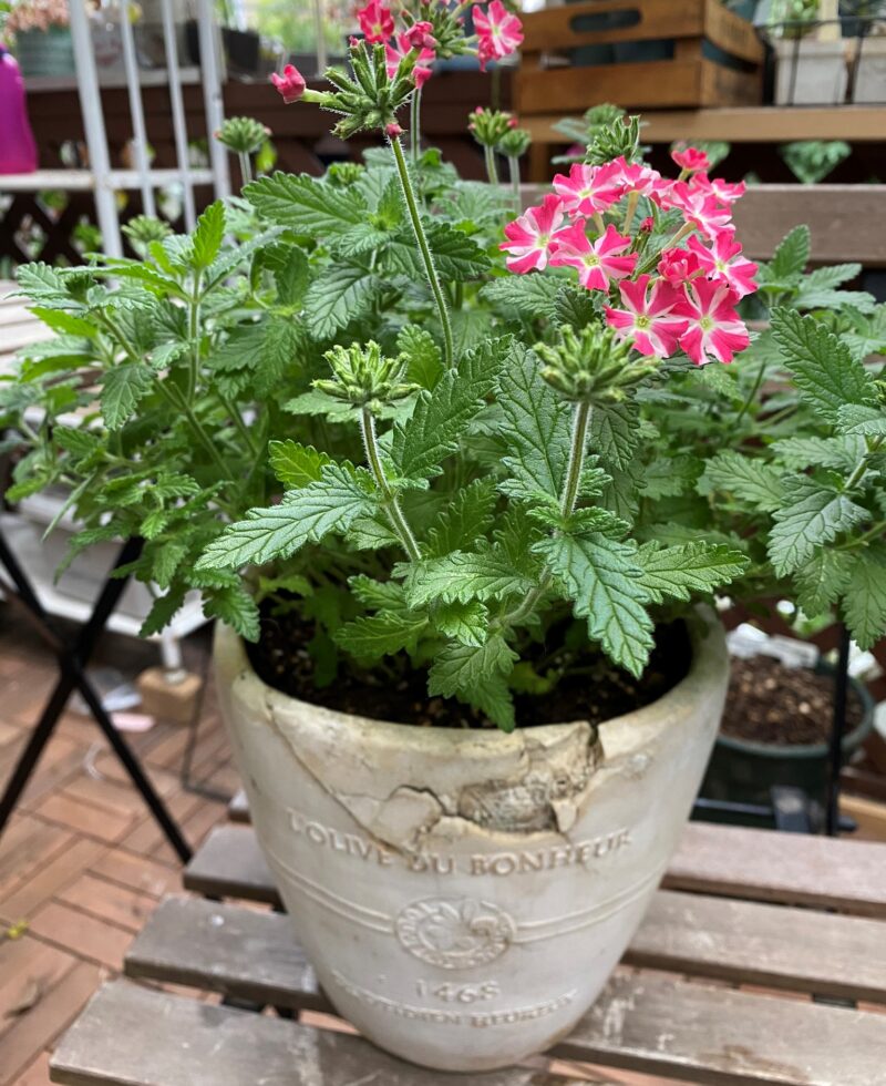 今日は、4月にグラスファイバー鉢に植え替えたスーパーベナのお手入れです。